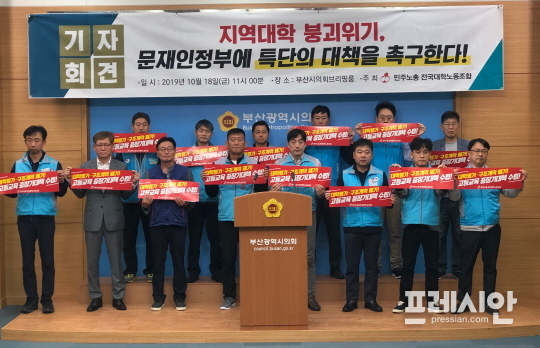 민주노총 전국대학노조는 18일 오전 부산시의회 3층 브리핑룸에서 기자회견을 열고 "대학과 고등교육 붕괴 위기에 대한 문재인 정부의 특단의 대책을 촉구한다"고 밝혔다.