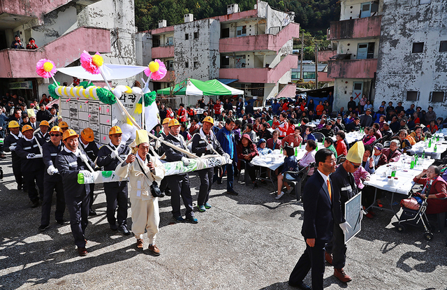 성동 화광아파트 앞에서 태백시 장성동 탄탄마을주민협의체(위원장 신승하)가 주최하고 태백시와 태백시도시재생지원센터가 후원한 ‘장성탄탄마을축제’가 개막한 가운데 지난 40년여간 국가 기간산업의 중추적 역할을 담당했던 탄광 근로자들의 보금자리 역할을 했던 화광아파트 장례식이 열리고 있다. ⓒ태백시