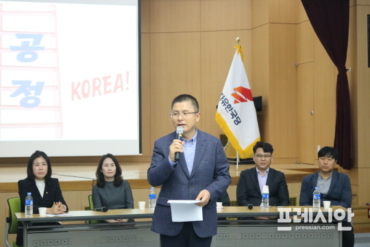 황교안 대표는 23일 오후 2시 30분 부경대 용당캠퍼스에서 열린 '저스티스 리그 공정 세상을 위한 청진기 투어'에 참석해 "임시처방으로 정시 확대 의견을 수렴해 당에서 당론으로 정시 50% 이상"이라며 정시 확대를 위한 법 개정까지 실시하겠다고 밝혔다.