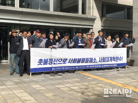 부산지역 시민사회, 종교, 노동, 풀뿌리단체 시국선언 연명 일동은 25일 오전 10시 부산시청 앞 광장에서 기자회견을 열고 "공수처를 비롯한 검찰개혁 법안 가로막는 자유한국당을 규탄한다"고 밝혔다.