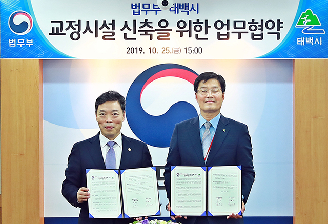 법무부(장관 직무대행 김오수)와 강원 태백시(시장 류태호)는 25일 태백지역 교정시설 신축사업의 성공적인 추진을 위한 업무협약식을 가졌다.