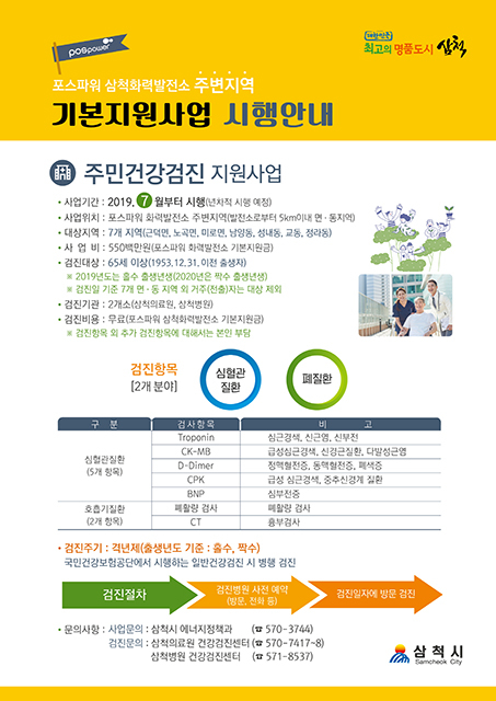 삼척시가 포스파워 삼척화력발전소 주변지역 기본 지원사업으로, 포스파워 화력발전소로부터 5킬로미터 이내 지역 주민들을 대상으로 무료건강검진을 지원한다.