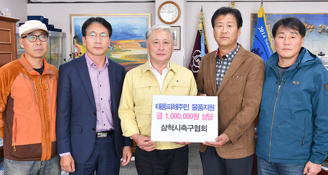 ▲28일 삼척시축구협회(회장 김승언)에서 태풍 피해 이재민들에게 전해달라며 김양호 삼척시장에게 100만 원의 성품을 기탁하고 있다. ⓒ삼척시