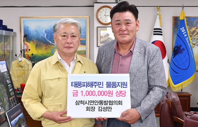 ▲28일 삼척시 연안통발협의회(회장 김성만)에서 태풍 피해 이재민들에게 전해달라며 김양호 삼척시장에게 100만 원의 성품을 기탁하고 있다. ⓒ삼척시