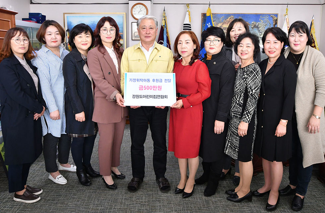 ▲28일 강원도어린이집연합회(회장 허경옥)에서 태풍 피해 이재민들에게 전해달라며 김양호 삼척시장에게 500만 원의 후원금을 기탁하고 있다. 이외에도 이날 삼척 운석산업에서 라면 100박스(184만 원 상당), 마루종합건설에서 500만 원 상당의 물품, 삼척홈플러스에서 컵라면 574박스(250만 원 상당)를 삼척시에 기탁했다. ⓒ삼척시