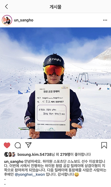 ▲SNS에 '청렴공감 릴레이'에 나선 2018 평창동계올림픽 은메달 주역 이상호 선수. ⓒ강원랜드