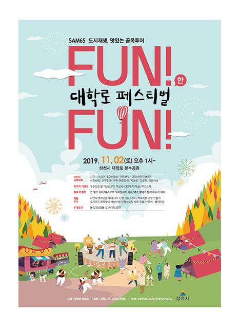 삼척시는 SAM65 도시재생사업의 일환으로 대학로 상권 활성화와 시민들이 참여하는 화합과 축제의 장을 마련하고자, ‘FUN! FUN!한 대학로 페스티벌’을 오는 11월 2일 삼척시 대학로 분수공원 일대에서 개최한다.