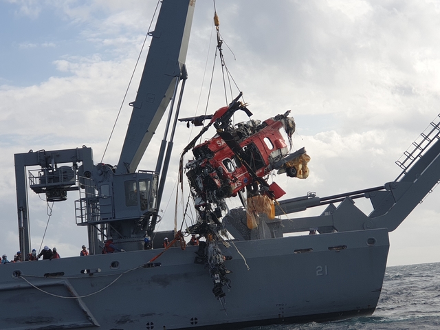 동해 해경청은 3일 오후 2시 4분경 추락했던 소방헬기 동체를 해군 청해진함 갑판위로 인양해 동체내 실종자 수색에 돌입했다고 밝혔다.