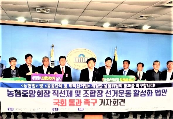 더불어민주당 김현권 의원과 농협조합장 정명회, 좋은 농협 만들기 국민운동본부, 농어업정책포럼은 4일 서울 여의도 국회 정론관에서 기자회견을 열고 “내년 1월 농협중앙회장 선거가 예정된 만큼 이번 정기국회가 마지막 기회”라며 직선제와 선거제도개선법안 정기국회 통과를 주장했다.