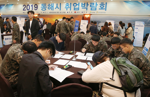 ▲6일 뉴동해관광호텔에서 구직자에게는 다양한 일자리 정보와 취업 기회를, 기업체에는 우수한 인재를 채용할 기회 제공을 위해 ‘2019년 동해시 취업박람회’를 개최하고 있다. 이날 박람회는 동해시가 주최하고 강원도·한국산업단지공단 동해지사가 공동 주관한 가운데 23개 기업체가 참여했다. ⓒ동해시