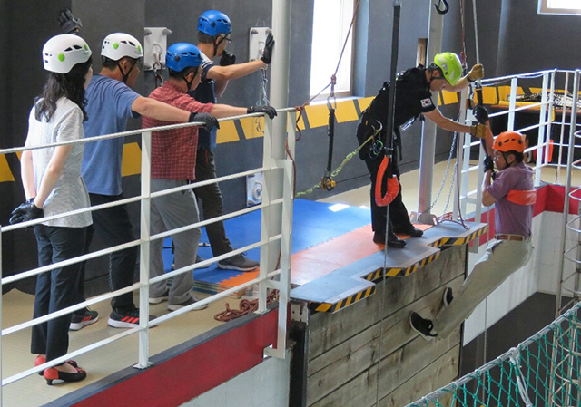 1일차 연수에서는 강원도교육청 최창호 장학관의 학교안전정책 강의와 상황별 응급상황 행동 요령 이론 수업, 심폐소생술 실습, 소화기 및 농연체험, 완강기 체험이 차례로 이어졌다.
