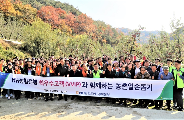 지난 4일 경북청사에서 첫 근무를 시작한 NH농협은행 경북영업본부(본부장 남재원)는 7일 안동시 풍천면에서 농협 최우수고객 70여명을 초청해 사과 수확 등 농촌일손돕기를 실시했다.