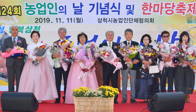 ▲11일 삼척문화예술회관 광장에서 개최된 ‘제24회 농업인의 날 행사’ 모범 농업인들에게 시상한 뒤 김양호 삼척시장과 수상자들이 기념촬영하고 있다. ⓒ삼척시