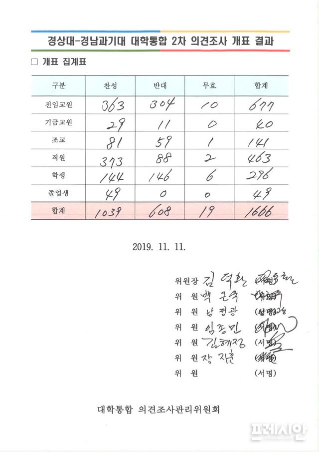 한편 경남과기대는 지난 8일 찬반투표 결과 가중치를 반영해 찬성 63.68%, 반대 35.77%(무효 0.55%)로 최종 집계됐다고 밝혔다.