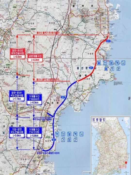 그동안 국도 31호선 부산·울산간 4차로 신설사업(21.5km, 5259억원)은 부산 기장군 이천리~임량리(5.8km, 1248억원)구간의 개통을 시작으로 부산 기장군 임량리~울주군 서생면(6.5km, 1913억원)구간을 개통해 공용 중에 있으며 이번 울주군 서생면~온양읍 9.2km 구간을 개통함으로서 사업을 마무리하게 됐다.