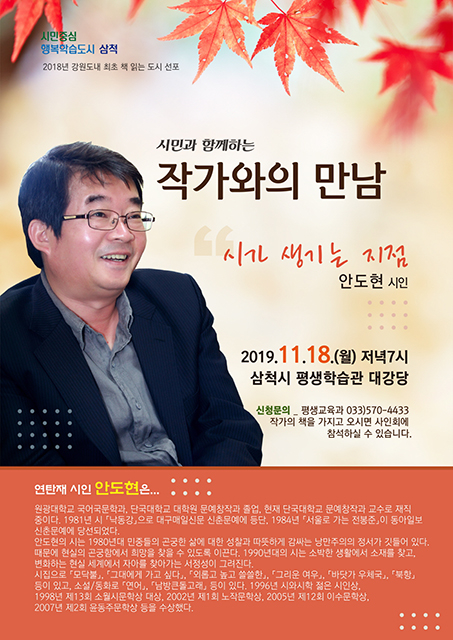 삼척시는 오는 18일 오후 7시 평생학습관 대강당에서 연탄재 시인 안도현 작가를 초청해 ‘작가와의 만남’을 운영한다.