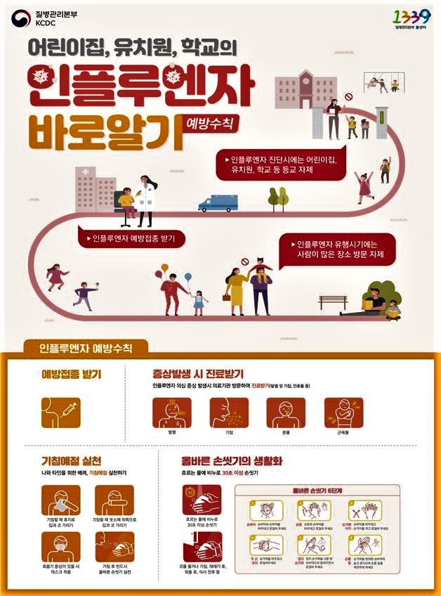 유행기간 동안 영유아 보육시설, 학교 등 단체 생활을 하는 시설은 인플루엔자 예방 관리를 강화하고, 인플루엔자 진단 시 등원·등교를 자제해야 한다.