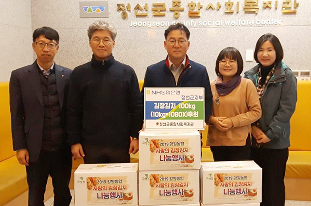 NH농협은행 정선군지부(지부장 김성용)는 18일 정선군종합사회지관을 찾아 추운 겨울을 맞아 지역 내 어려운 이웃들이 건강하고 따뜻한 겨울을 보낼 수 있도록 사랑의 김장김치(10킬로그램) 10박스를 전달했다.