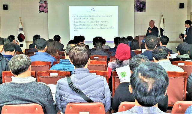 이날 초청된 ‘테오 드 그라프(Theo de Graaf)’는 네델란드 반 에그몬드(Van Egmond)사의 리시안셔스 스페셜리스트로 리시안셔스 재배법과 신품종에 대해 발표했다.
