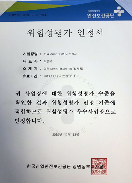 한국광해관리공단 강원지사(지사장 최상욱)는 최근 한국산업안전보건공단으로부터 ‘위험성평가 우수사업장’으로 인정받았다고 19일 밝혔다.