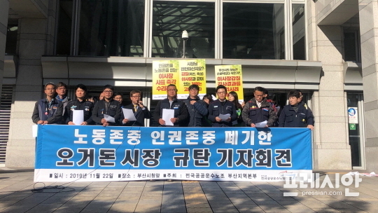 전국공공운수노조 부산지역본부와 부산신용보증재단 노조는 22일 오전 10시 부산시청 앞 광장에서 기자회견을 열고 "오거돈 시장은 부산신용보증재단 이병태 이사장의 사표를 즉각 수리하라"고 촉구했다.