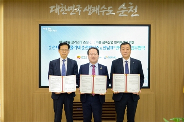 (재)전남테크노파크는 지난 26일 순천시청에서 금속산업 발전 및 중소기업 활성화를 위한 인력양성에 상호 협력하기 위한 업무협약을 순천시, 한국폴리텍대학(순천캠퍼스)과 체결했다고 밝혔다.