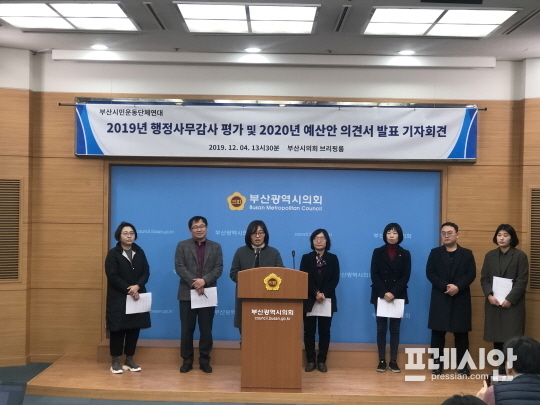 부산시민운동단체연대는 4일 오후 부산시의회 3층 브리핑룸에서 '2019년 행정사무감사 평가 및 2020년 예산안 의견서 발표' 기자회견을 가졌다.
