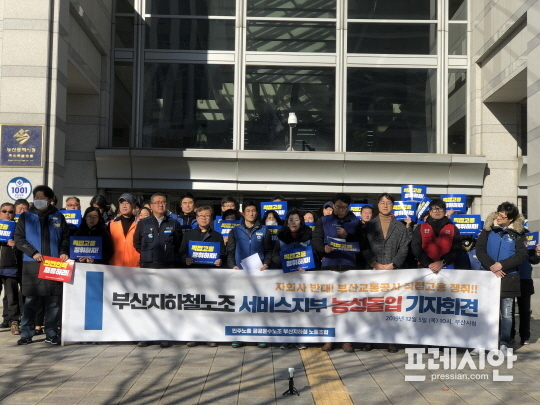 부산지하철노조는 5일 오전 10시 부산시청 앞 광장에서 기자회견을 열고 지하철 청소 노동자들의 직접 고용을 촉구했다.