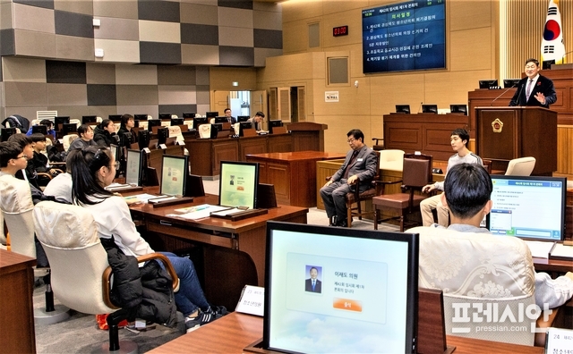 학생들은 처음 경험해보는 의사진행에서 정견발표와 감표 등을 직접 해 의장을 선출하고, 찬반 토론 및 전자투표를 통한 조례안과 건의안을 처리하는 등 실제 경북도의원으로서의 본회의 의정 활동을 직접 체험했다.