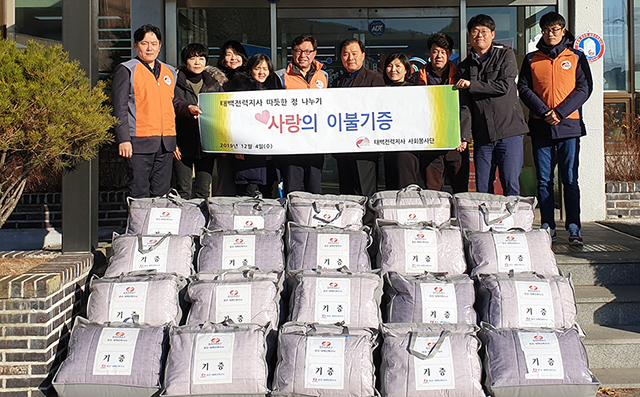 한국전력공사 태백전력지사 윤동수 지사장과 임직원들이 지난 5일 태백시 상장동 행정복지센터를 찾아 겨울철 소외계층들의 따뜻한 겨울나기를 위한 이불 20채를 기탁했다.