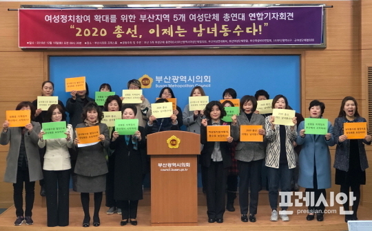 부산 5개 여성단체 총연대(부산시여성단체협의회, 부산여성연대회의, 부산여성단체연합, 부산여성NGO연합회, 부산시구·군여성단체협의회)는 10일 오전 부산시의회 3층 브리핑룸에서 기자회견을 열고 "각 정당은 공천 과정에서 여성의 정치참여와 대표성 확대를 위해 실질적인 여성 할당 제도를 보장하고 동수 정치를 실현하라"고 촉구했다.