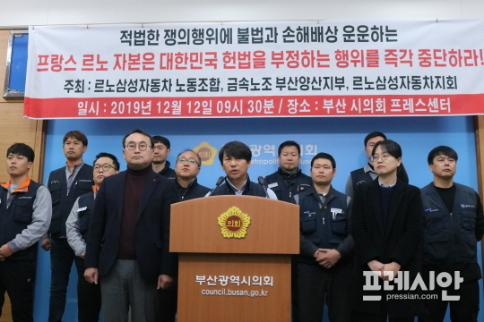 르노삼성차노조와 금숙노조 부산양산지부 르노삼성차지회는 12일 오전 부산시의회 3층 브리핑룸에서 기자회견을 열고 "적법한 쟁의행위에 불법과 손해배상 운운하는 르노삼성, 부당노동행위를 즉각 중단하라"고 촉구했다.