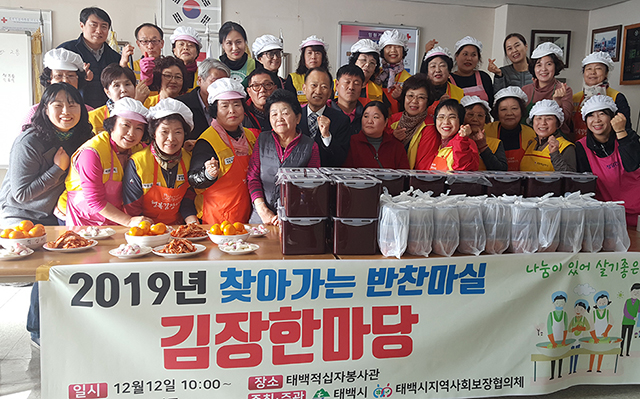강원 태백시지역사회보장협의체(공동위원장 백충상)는 지난 12일 대한적십자사 태백지회(회장 최정자) 회원 40명과 함께 ‘2019 찾아가는 반찬마실 김장한마당’ 행사를 개최했다.