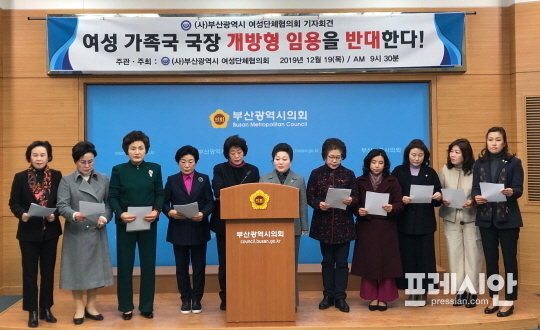 부산시여성단체협의회는 19일 오전 부산시의회 3층 브리핑룸에서 기자회견을 열고 "부산시는 여성가족국장을 개방적 직위로 바꾸는 입법 예고 사항에 대해 철회하라"고 요구했다.
