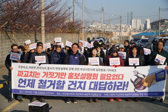 특히 "오늘 현장설명회 강행과 그 과정에서 무능의 극치를 보인 부산시와 시민들의 정당한 항의를 가로막아 마찰을 빚은 경찰은 부산시민의 생명 안전을 위협하는 미군과 공범이다"며 "시민사회가 제기해왔던 세균실험실의 존재와 세균 실험이 미군에 의해 확인됐다. 그동안 거짓과 기만을 일삼아온 주한미군이 무슨말을 하든 발표되는 현장설명회 내용 그 어떤 것도 그대로 믿는 부산시민은 없을 것이다"고 밝혔다.