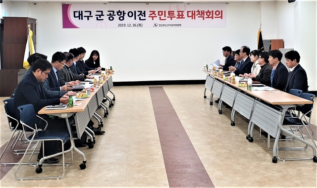 경북도선거관리위원회는 26일 군위군선거관리위원회 회의실에서 경북도위원회 및 군위군·의성군위원회 사무과장 등 직원 20여명이 참석한 가운데 내년 1월 21일 실시하는 ‘대구 군 공항 이전 유치 주민투표’대책회의를 개최했다.