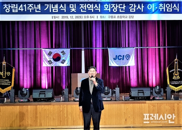 장경식 경북도의장은 28일 구룡포 초등학교 강당에서 열린 구룡포 청년회의소 창립 41주년 기념식 및 회장단 이. 취임식에 참석해 이임회장단과 취임회장단을 축하했다.