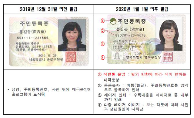 주민등록증 하단에는 보는 각도에 따라 사진과 생년월일이 나타나는 다중레이저 이미지가, 왼쪽 상단에는 빛의 방향에 따라 색상이 변하는 태극문양이 추가됐다.