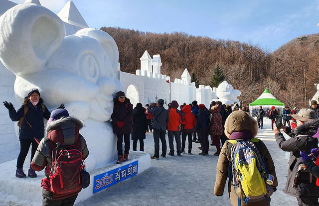 ▲제27회 태백산 눈축제 개막 3일째를 맞은 12일 태백산국립공원 당골광장에 설치된 '2020 쥐띠해 눈조각' 주변에서 관광객들이 기념촬영하고 있다. 올해 눈조각 중 쥐띠해 기념 눈조각이 가장 많은 인기를 끌고 있다.ⓒ프레시안(홍춘봉)