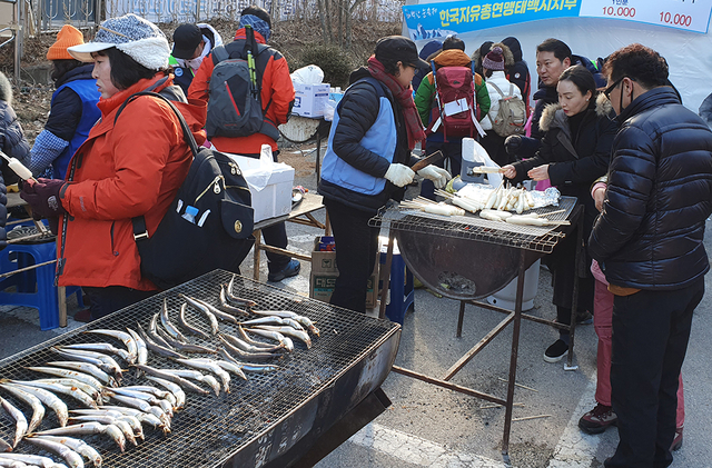 ▲제27회 태백산 눈축제 개막 3일째를 맞은 12일 태백산국립공원 임시 상가를 찾은 관광객들이 양미리와 가래떡 구이판에서 차례를 기다리고 있다. ⓒ프레시안(홍춘봉)