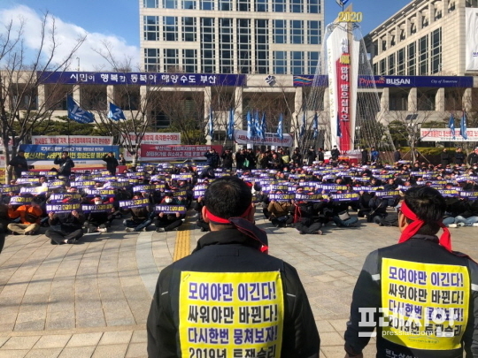 르노삼성차 노조는 13일 오후 1시 부산시청 앞 광장에서 '2019년 임금협상 완전쟁취를 위한 집회'를 열고 "불법 직장폐쇄 노동자 탄압하는 르노삼성 이제는 부산시장과 부산시가 나서서 지역경제 피해 확산 조기 진압하라"며 "부산시장은 르노삼성 노사 합의에 숟가락 얻을려고 하지 말고 직접 나서라"고 촉구했다.