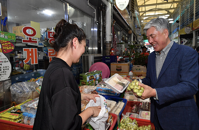 또한, 최 군수는 전통시장을 돌며 시장 상인들을 격려하고 애로사항에 대해 이야기를 나누는 소통의 시간을 가졌으며 전통시장을 이용하는 방문객들에게 전통시장을 많이 이용해 줄 것을 당부했다.