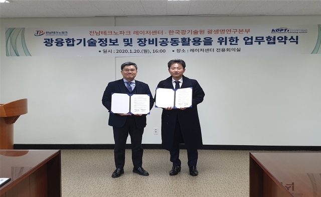 (재)전남테크노파크(원장 유동국)는 한국광기술원(본부장 이병일)과 지난 20일 레이저센터 회의실에서 전남지역 레이저산업관련 중소기업의 광‧융합기술정보제공 및 장비공동활용을 위한 업무협약을 체결했다.