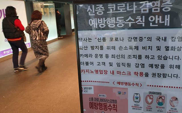 ▲신종 코로나 바이러스 감염증(우한 폐렴)의 확산으로 보건당국이 비상에 걸린 가운데 2일 강원랜드 카지노 입구에 신종 코로나 감영증에 대한 안내문을 부착해 놓고 있다. 이날 강원랜드를 찾은 고객들 가운데 마스크를 착용한 고객들은 전체의 10% 수준에도 미치지 못하는 것으로 알려졌다. ⓒ프레시안(홍춘봉)