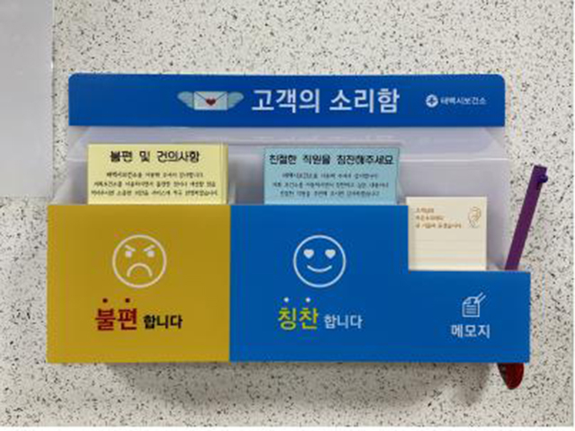 강원 태백시보건소는 고객의 작은 소리에도 귀 기울이는 열린 소통행정을 실현하고 친절 서비스를 제공하기 위해 보건소 로비에 ‘고객의 소리함’을 설치·운영한다고 밝혔다.