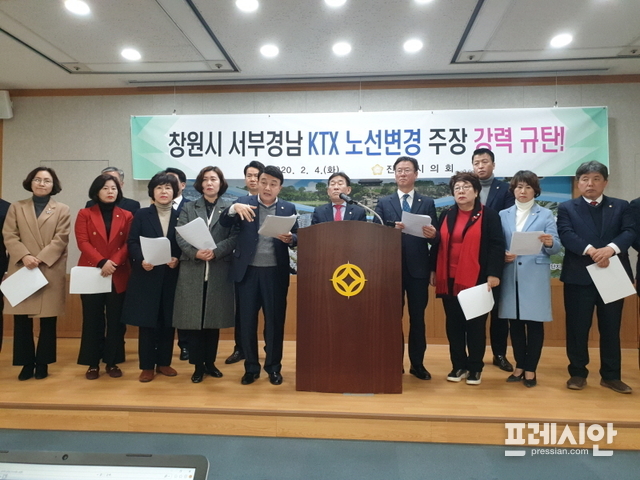 경남 진주시의회 의원들이 4일 진주시청 브리핑룸에서 기자회견을 열고 “최근 창원시의‘남부내륙고속철도(서부경남KTX) 노선변경 요구’로 서부경남 주민들이 분노하고 있다”고 밝혔다.