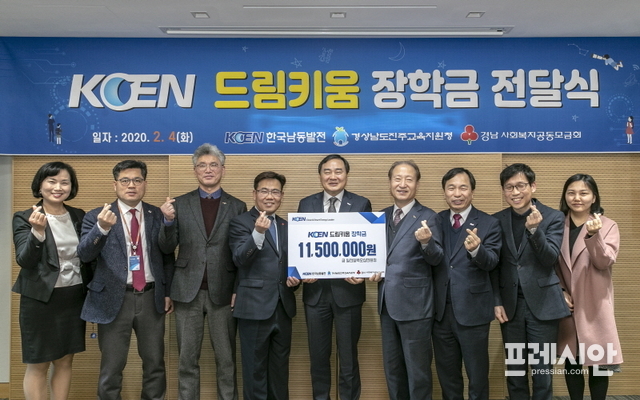 한국남동발전은 4일 한국남동발전 진주 본사에서 김학빈 한국남동발전 기획관리본부장, 심낙섭 경상남도 진주교육지원청 교육장, 유병설 경남사회복지공동모금회 사무처장 등 관계자 10여명이 참석한 가운데 ‘KOEN 드림키움 장학사업’의 장학금 전달식을 가졌다.
