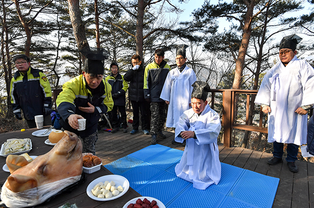 강원 정선군 여량면 의용소방대(대장 김중호)는 지난 8일 해발 668미터 염장봉 정상에 올라 소금단지를 묻고 마을의 안녕을 기원하는 제례를 봉행했다.