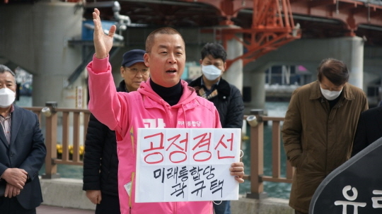 미래통합당 곽규택 부산 중·영도구 예비후보는 26일 부산 영도대교 앞에서 '이언주 전략공천 반대' 삭발식을 진행했다.