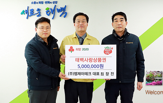 강원 태백시 상장동 ㈜엠제이테크(경영대표 최창진)는 27일 태백시청을 찾아 류태호 태백시장에게 지역 내 여려운 이웃을 돕기 위한 ‘희망 2020’ 태백사랑상품권 500만 원을 기탁했다.